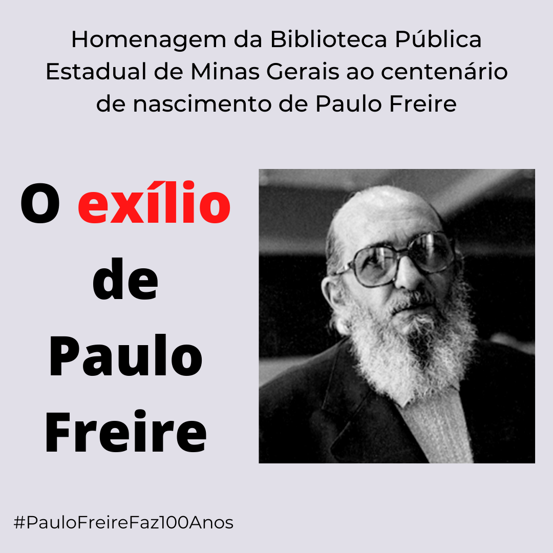 No ano em que comemoramos o centenário de nascimento de Paulo Freire, a Biblioteca Pública Estadual de Minas Gerais promove uma programação especial em suas redes socias para homenagear o Patrono da Educação Brasileira. Todo dia 19 de cada mês, serão publicados conteúdos diversos a respeito da vida e da obra do pedagogo. Em junho, abordamos o exílio de Freire, que ocorreu durante a ditadura militar brasileira.