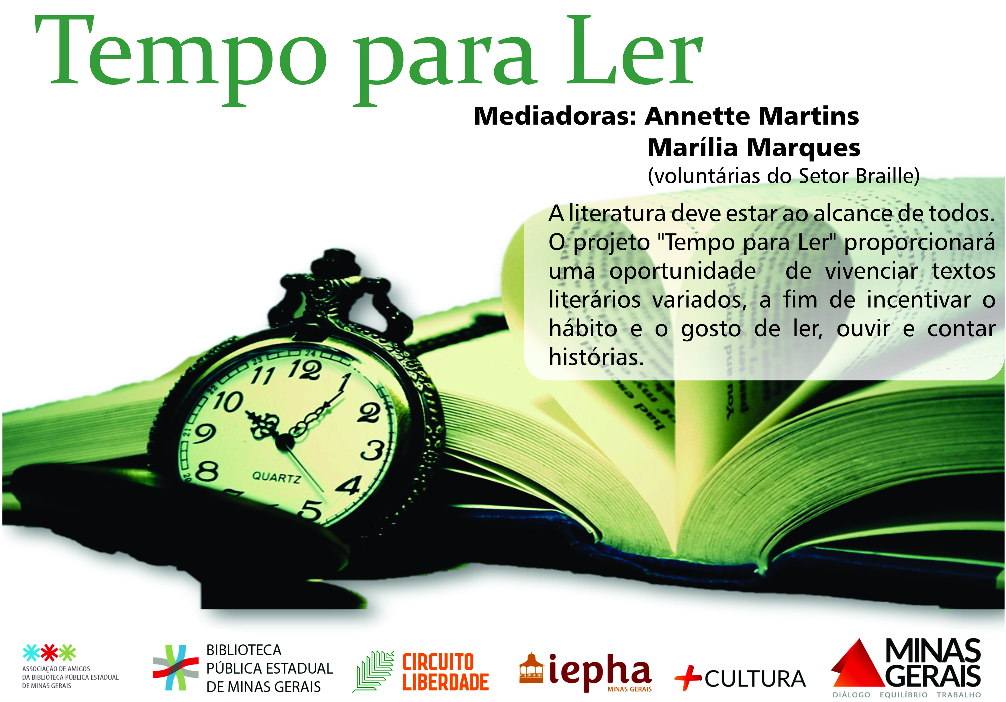 O projeto "Tempo para ler" tem como objetivo proporcionar aos participantes , em especial aos usuários do Setor Braille da Biblioteca Pública Estadual de Minas Gerais, uma oportunidade de audição de textos literários variados, a fim de incentivar o hábito e o gosto de ler, ouvir e contar histórias.